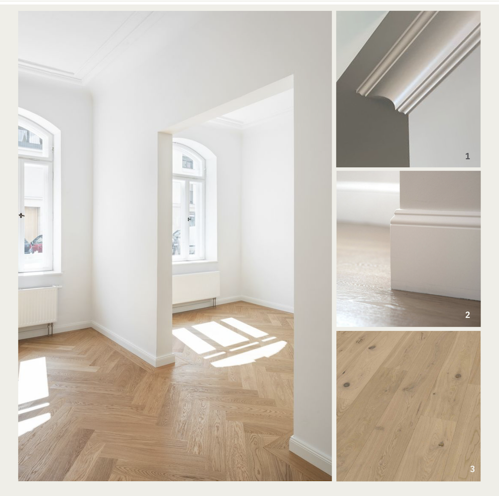 Die Wohnräume werden durch minimalistische Stuckelemente und Altberliner Sockelleisten in Weiß ergänzt, die dem historischen Charme des Hauses Ausdruck verleihen und gleichzeitig einen modernen, hochwertigen Akzent setzen.